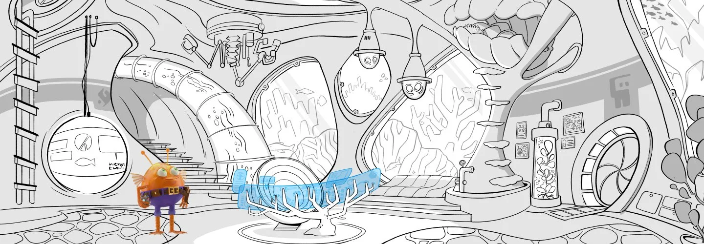 The designers worked closely from the storyboards and layout to ensure the right backgrounds were painted for each angle or moment in the story. Creating a wide shot usually covered most of the action and allowed Obki and the Orb to move freely left and right without feeling too limited within the frame.